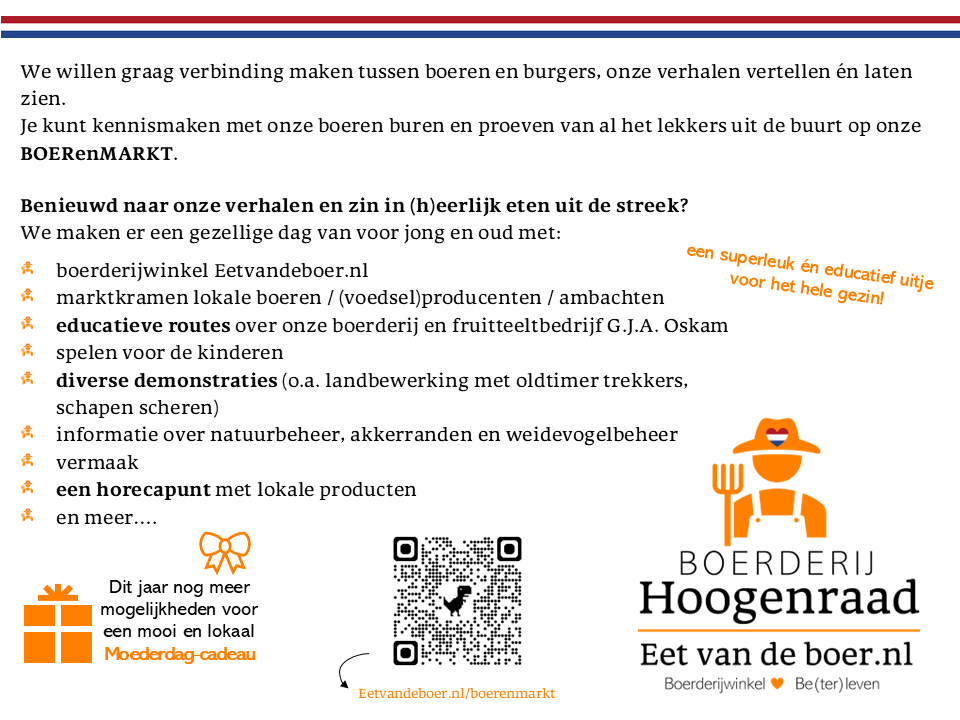 Boerderij Hoogenraad kan lunchpakketjes verzorgen. Deze worden dan rond 11.30 uur bij de kraam afgeleverd. De kosten per lunchpakket zijn € 9,50.