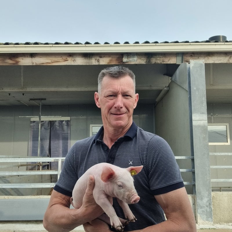 Wim van Vulpen, ook wel bekend als de Zingende Varkensboer 🐽🎶, houdt Zwitsers Landras varkens (kruising Piétrain) in moderne stallen met uitloop en modderpoel.